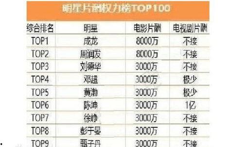 你有没有听说最近的大陆明星片酬排行榜?这可是娱乐圈里的一股热浪,让人忍不住想一探究竟。咱们就一起来揭开这神秘的面纱,看看都有哪些明星在这份榜单上闪耀吧!